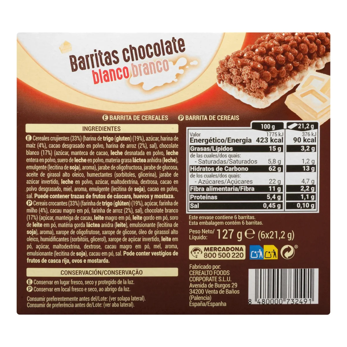 Barritas de cereales Hacendado con chocolate blanco, un clásico del mercado español. Forma parte de la variedad de barritas de cereales. Ideal para españoles fuera de Europa que buscan sabores de casa y para europeos que quieren disfrutar de productos auténticos de España.