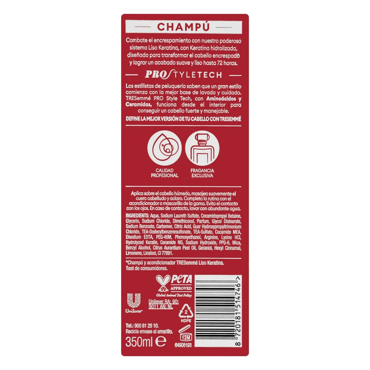 Champú Liso Keratina TRESemmé cabello encrespado o dañado para el cuidado diario.