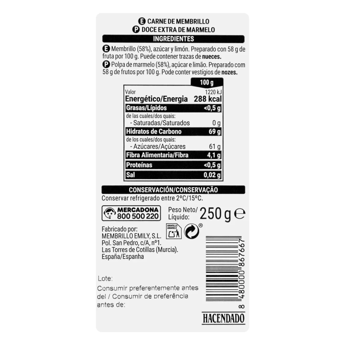 Dulce de membrillo taco Hacendado con auténtico sabor español.