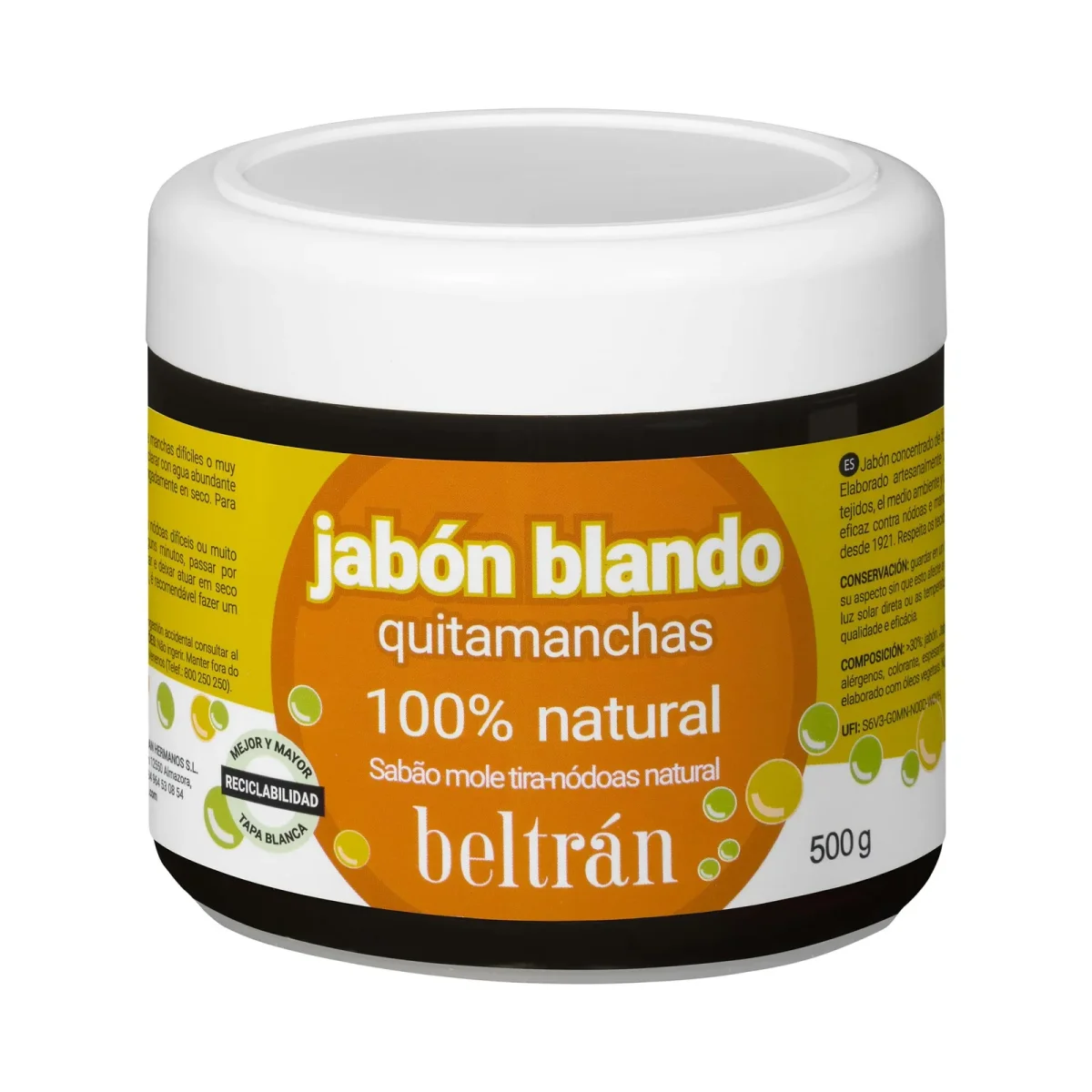 Jabón blando 100% natural Beltrán quitamanchas, producto de limpieza del hogar fabricado en España.
