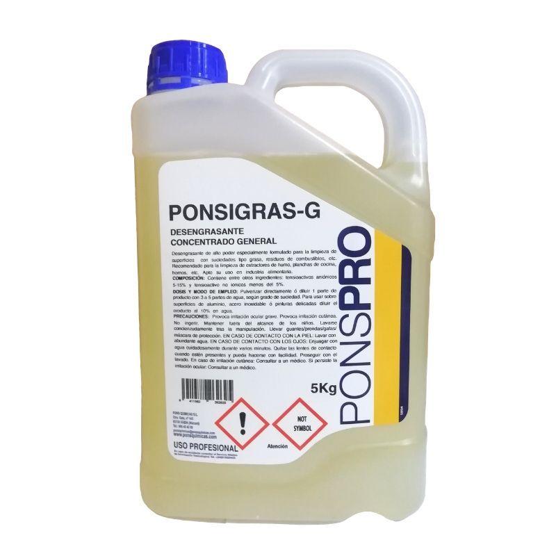 Ponsigras G Desengrasante concentrado de alto poder, especialmente formulado para limpieza de superficies tipo grasa, residuos de combustibles… Recomendado para la limpieza de extractores de humos, planchas de cocina, hornos, etc