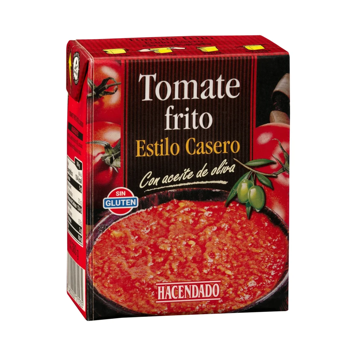 Tomate frito estilo casero Hacendado, un clásico del mercado español. Forma parte de la variedad de tomate. Ideal para españoles fuera de Europa que buscan sabores de casa y para europeos que desean productos auténticos de España.
